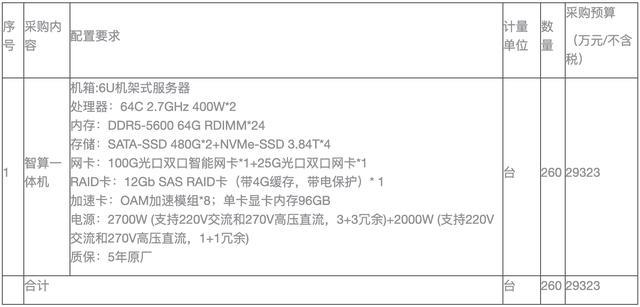 该技俩于3月9日发布招标文献,采购本色包含260台智算一体机。这次中场合智算一体机参数为64核、主频2.7GHz,功耗400W。
